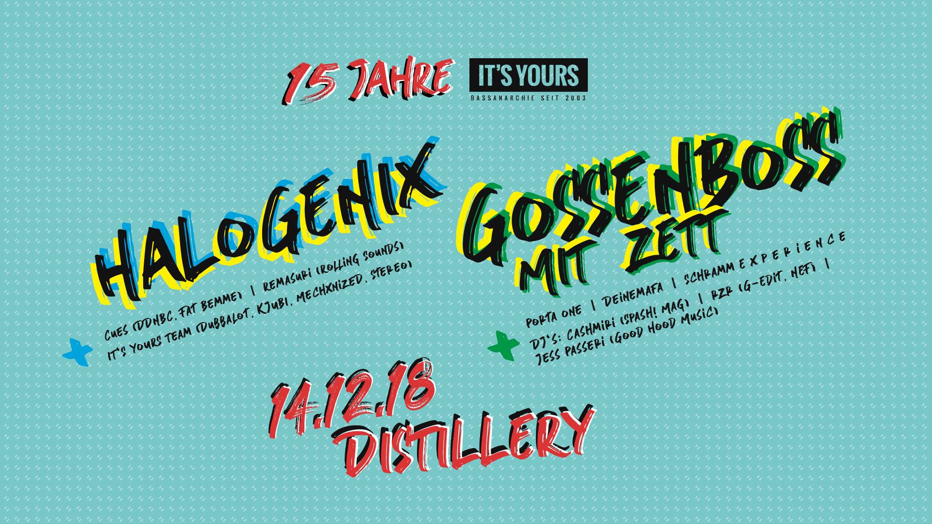 15 Jahre ehrenamtliche Arbeit für die hiesige Drum & Bass und Hip Hop Szene kann man schon mal gebührend feiern. Ok, zugegebenermaßen die Geburtstagsfeier eines der ältesten Leipziger Szeneblogs in der Distillery ist inzwischen Tradition. Aber 15 Jahre fühlen sich schon sehr besonders an. Außerdem hat sich der Blog in den letzten zwei Jahren durch Teamzuwachs, neue Formate im Bereich Video und Radio enorm erweitert. All das sind gute Gründe, es dieses Jahr etwas mehr krachen zu lassen. Das passiert am Besten, indem man Halogenix aus London einfliegen lässt, Gossenboss mit Zett einlädt und diesen deliziösen Hauptgang liebevoll mit großartigen Acts aus der Nachbarschaft garniert. Markiert Euch den heutigen Tag fett im Kalender. Das Team um die Distillery und It�s Yours ziehen den Jahresabschluss um ca. zwei Wochen vor. Danach könnt ihr entspannt in die 2018er Afterhour gehen.