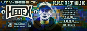 UTM-SESSION with HEDEX!!! Nachdem ihr uns bei Macky Gee die Bude eingerannt habt, wollen wir euch diesmal eine größere Location zur Verfügung stellen, damit beim ausgelassenen Tanz zu HEDEX jeder seinen Platz finden kann. Für dieses Event steht uns ein Teil der Reithalle zur Verfügung. Während sein Mäzen DJ Guv bei den diesjährigen DnB-Awards u.a. in “best dj” und “best track” nominiert war, ist es wohl nur eine Zeitfrage, bis sein Ziehsohn HEDEX in seine Fußstapfen treten wird. Die Nominierung…