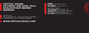 Critical | Dark | Neurofunk | Deep ★ ENEI★ Critical || St. Petersburg, RUS https://soundcloud.com/enei | https://www.facebook.com/eneiofficial ★ KASRA★ Critical || London, UK https://soundcloud.com/kasra-critical | https://www.facebook.com/kasracriticalmusic Support: ★ PHIL GONZO★ Lifeline || Bremen, GER https://www.mixcloud.com/getgonzo/ | http://www.facebook.com/getgonzo ★ CELLOMO ★ D&B Interface || Bremen, GER http://www.mixcloud.com/cellomo | www.facebook.com/djcellomo ★ STYLEZ ★ Brainstormaz || Bremen, GER https://soundcloud.com/djstylez76 | https://www.facebook.com/Dj-Stylez-284582141577133/ ★ SHARKEYD ★ Soul:unity || Berlin, GER https://soundcloud.com/deepsoul | www.facebook.com/deepsoul.de No MC, just Music! -------------------------------------------------------------------------- Pressetext: Wir geben euch, was Ihr wollt!…