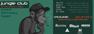 JUNGLE CLUB -on tour- Pasel Birthday Bash Sa 09.01.16 @ Kessel, Offenburg 23 Uhr | 5 € Line-Up: PHILTH WADJIT PANE MUA PASEL MC FAVA Pressetext: Soon to come Links: https://www.facebook.com/philthdj https://soundcloud.com/philth https://www.facebook.com/wadjitdnb/ https://soundcloud.com/wadjit https://www.facebook.com/panemuaofficial/ https://soundcloud.com/panemua https://www.facebook.com/PaselDnb https://soundcloud.com/user9670072 https://www.facebook.com/FavaMC https://soundcloud.com/mcfava
